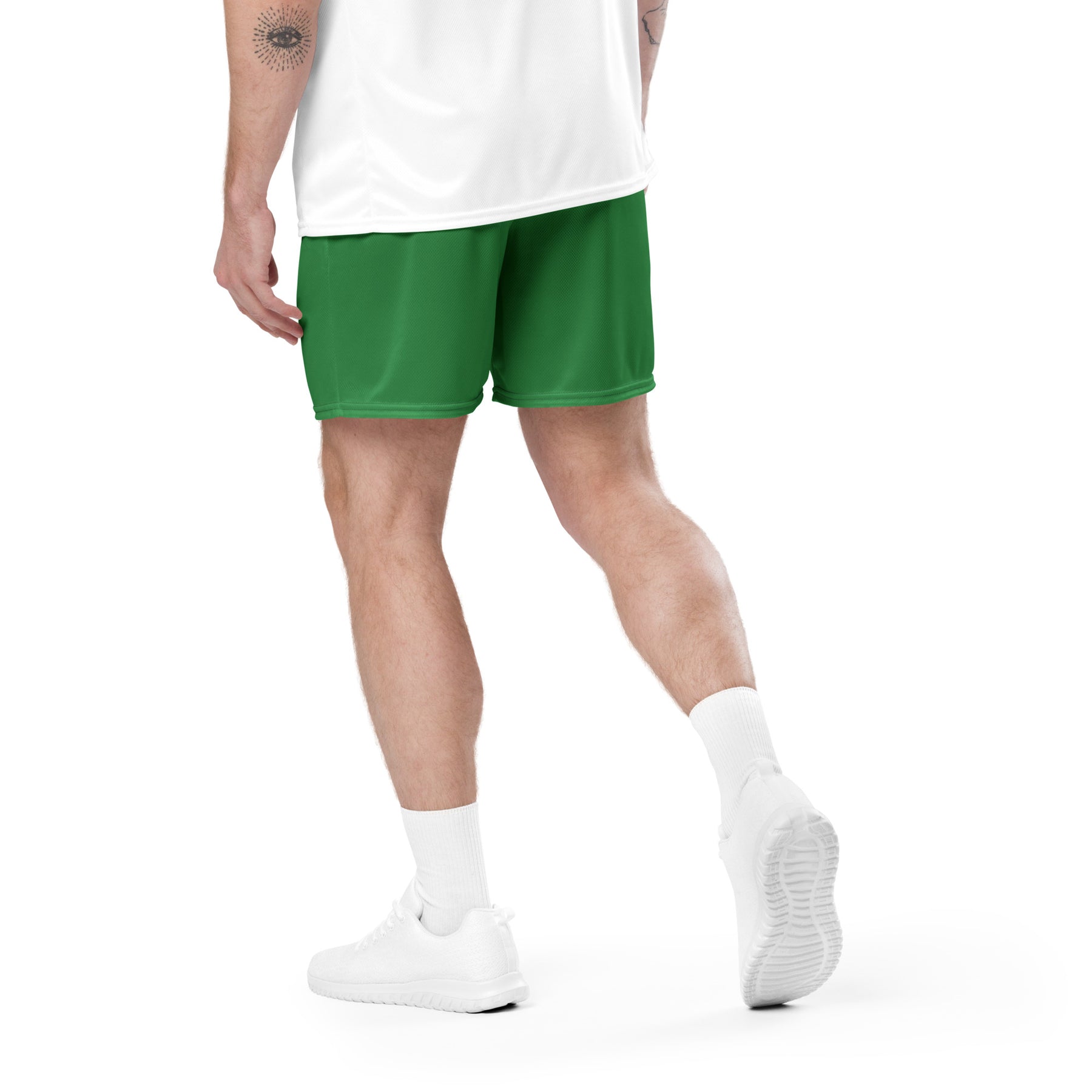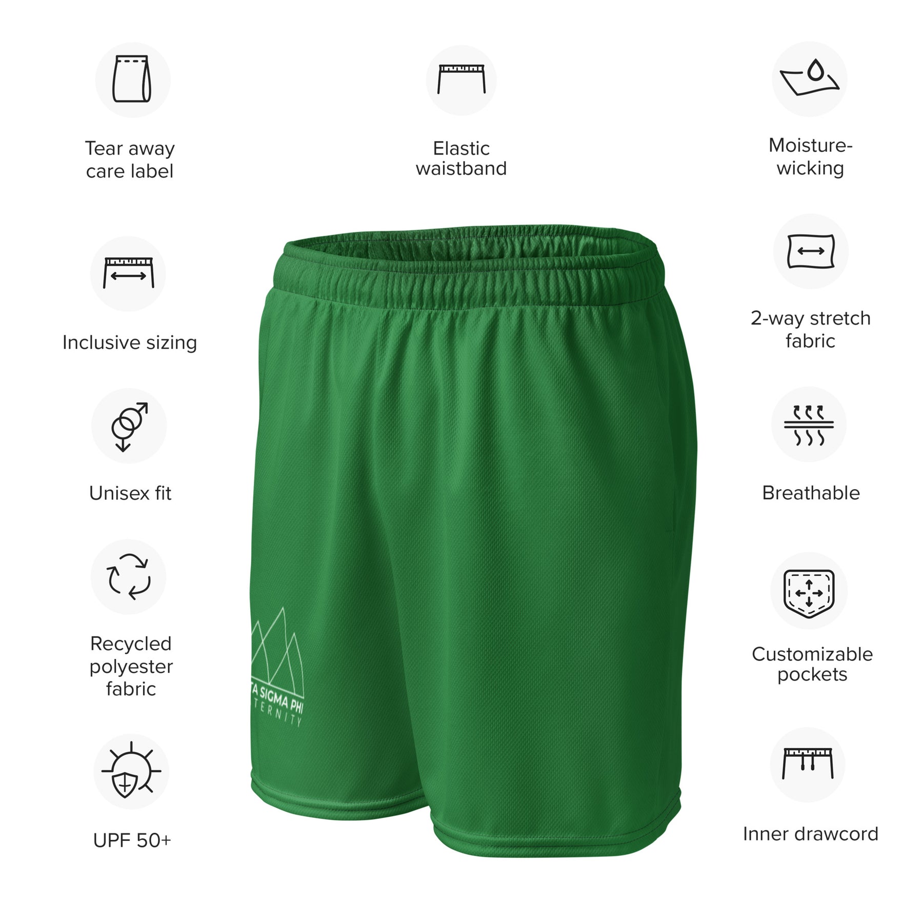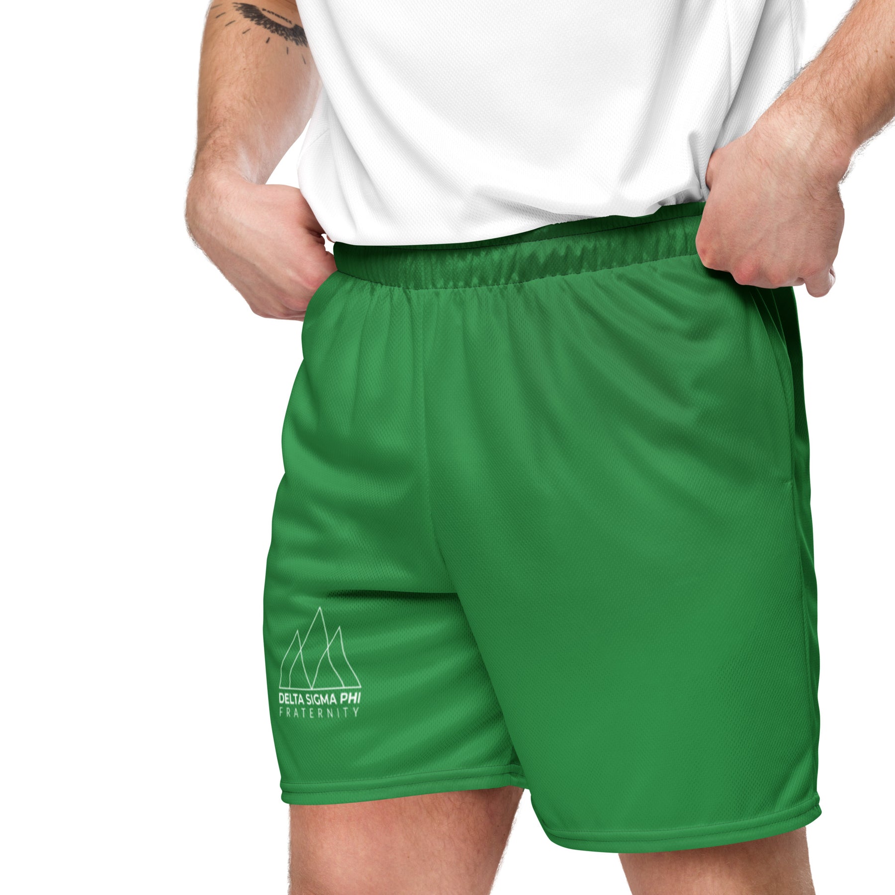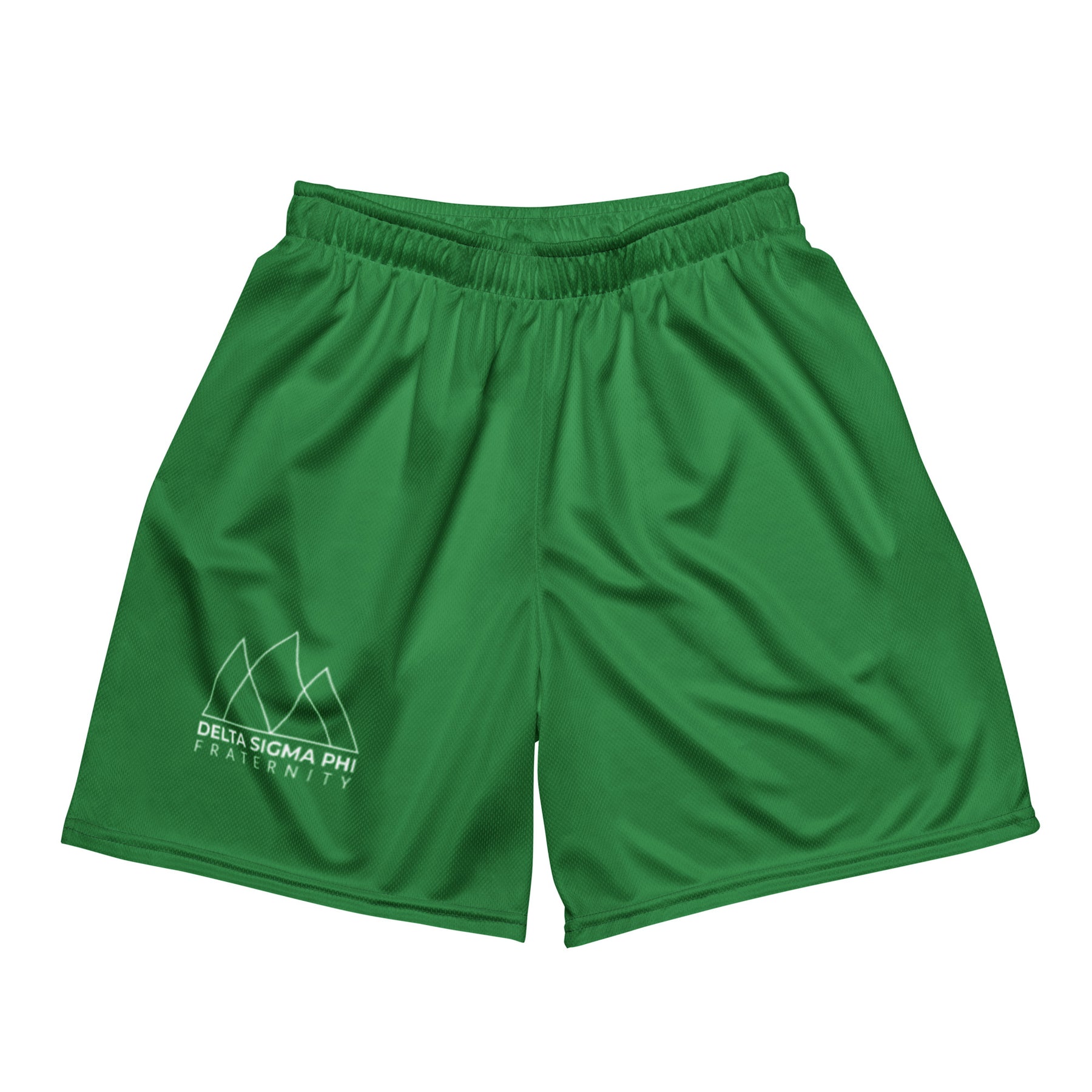 Delta Sigma Phi Mesh Shorts in green with horizontal logo shown in flat view