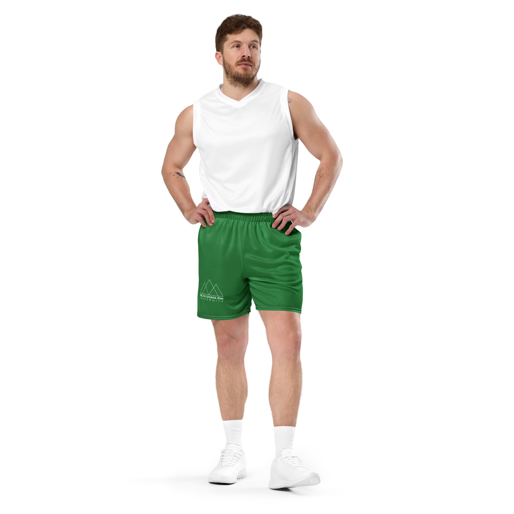 Delta Sigma Phi Mesh Shorts with horizontal logo in green shown on model