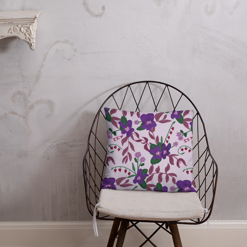 Sigma Kappa Dove Mascot Reversible Pillow showing back of pillow with violet floral print