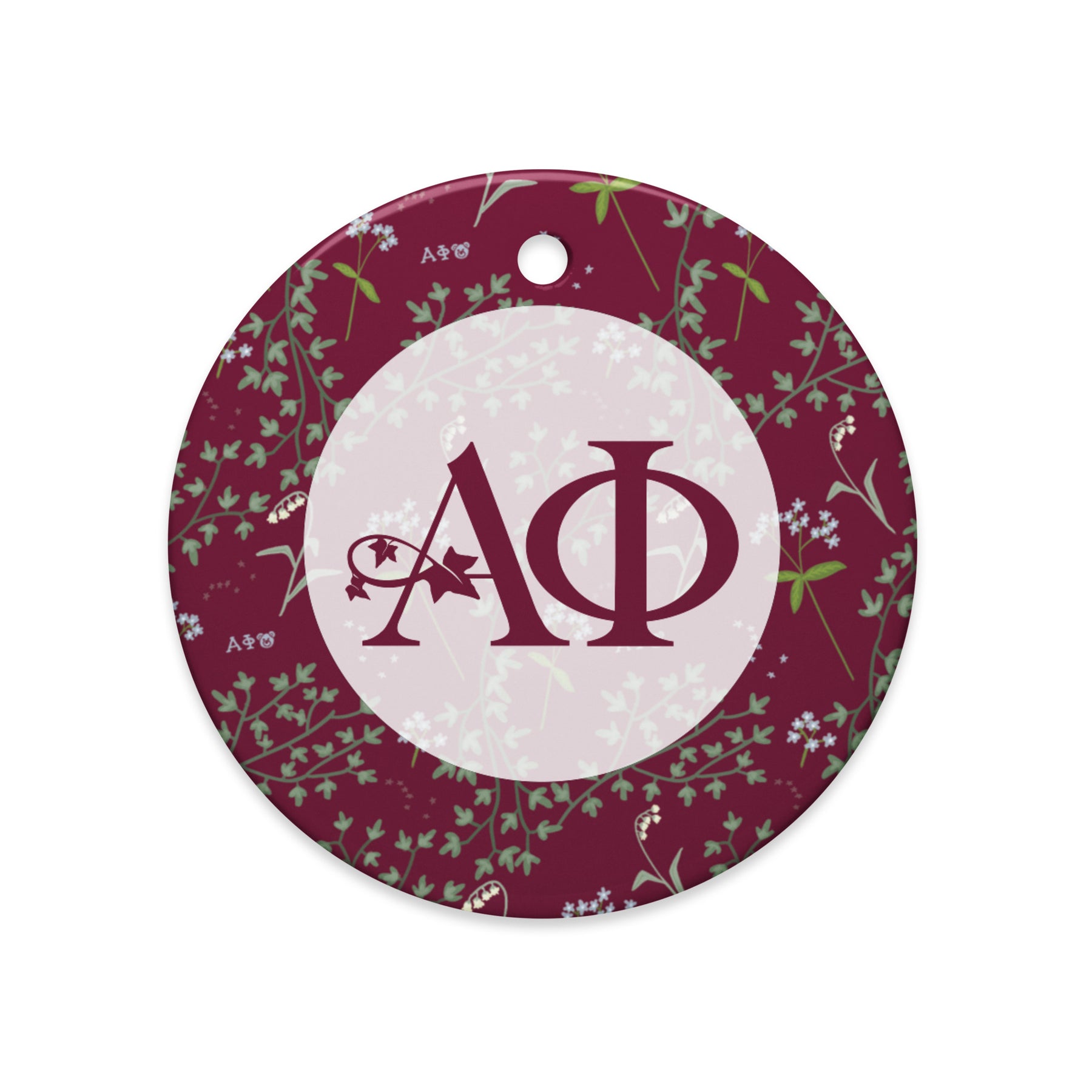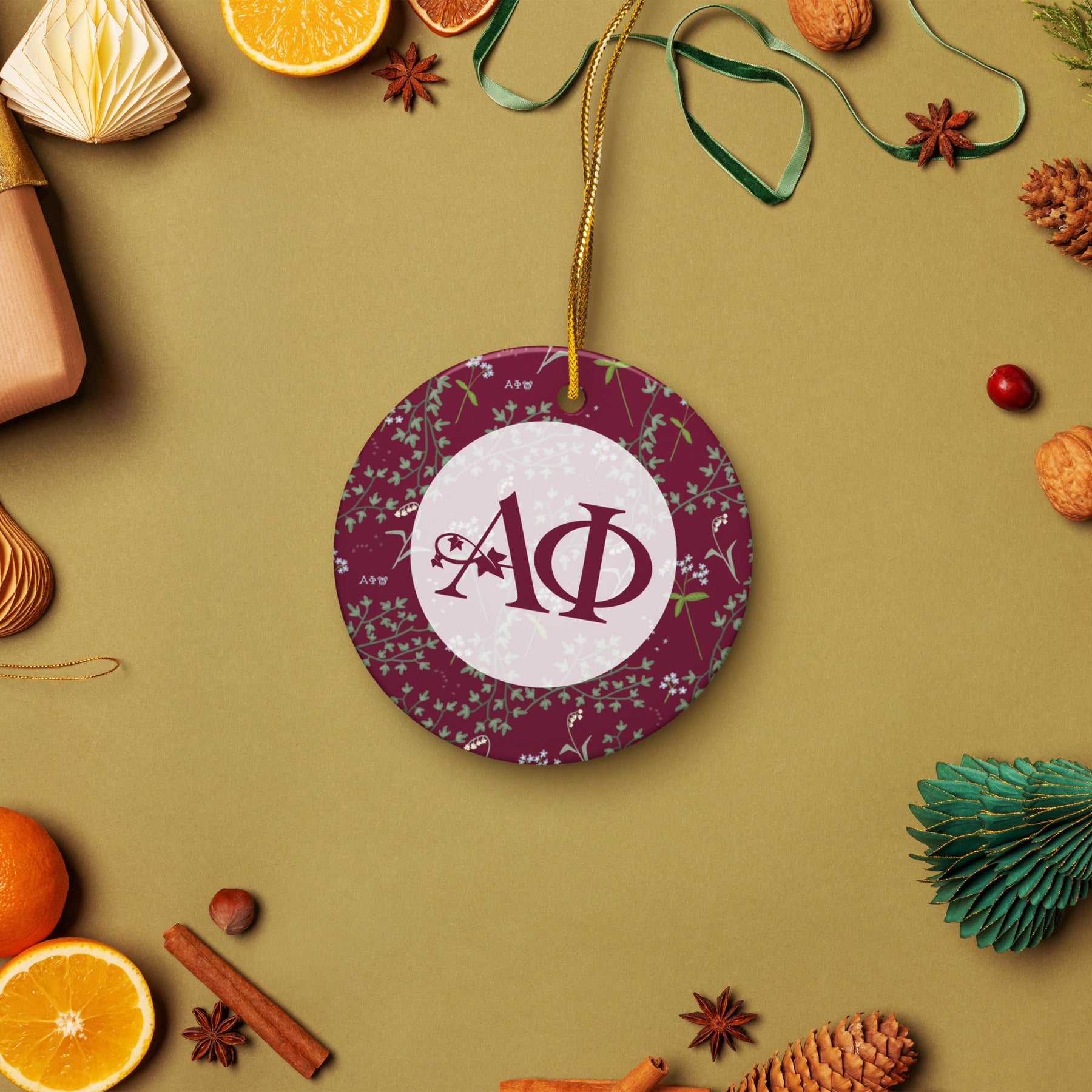 Alpha Phi Holiday ornament with A Phi logo and ivy and lily floral print accents