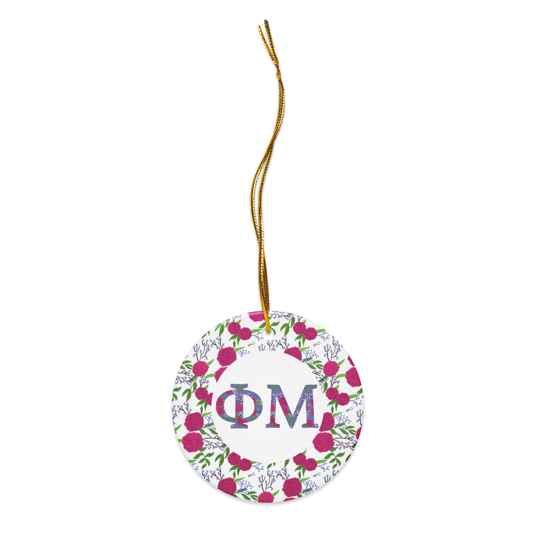 Phi Mu Ceramic Ornament shown in close up view with filled Phi Mu letters and floral trim shown with gold hanging thread