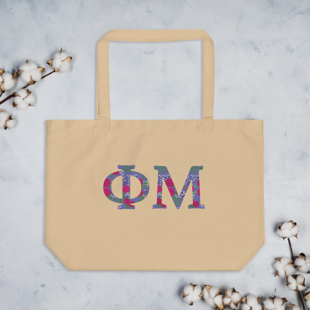 Phi Mu Filled Letters Tote Bag in natural oyster shown with cotton blossoms