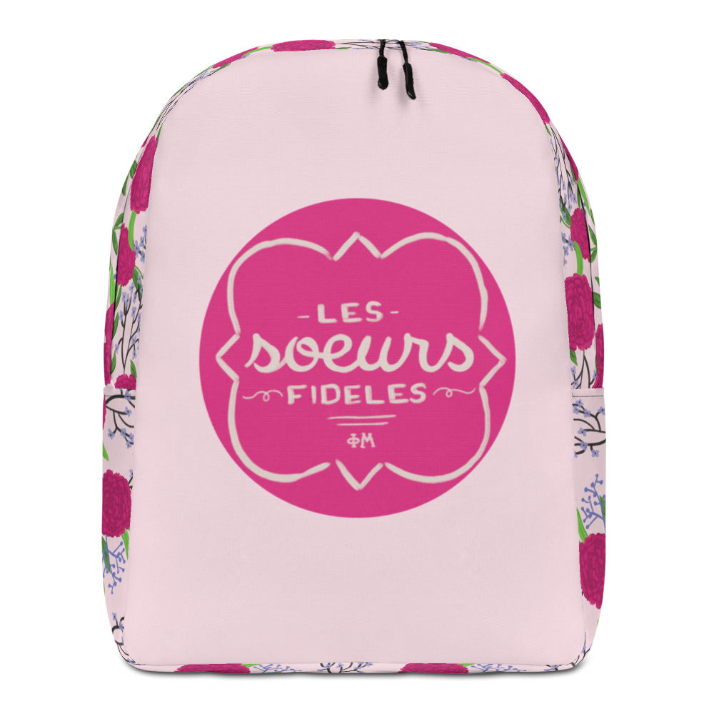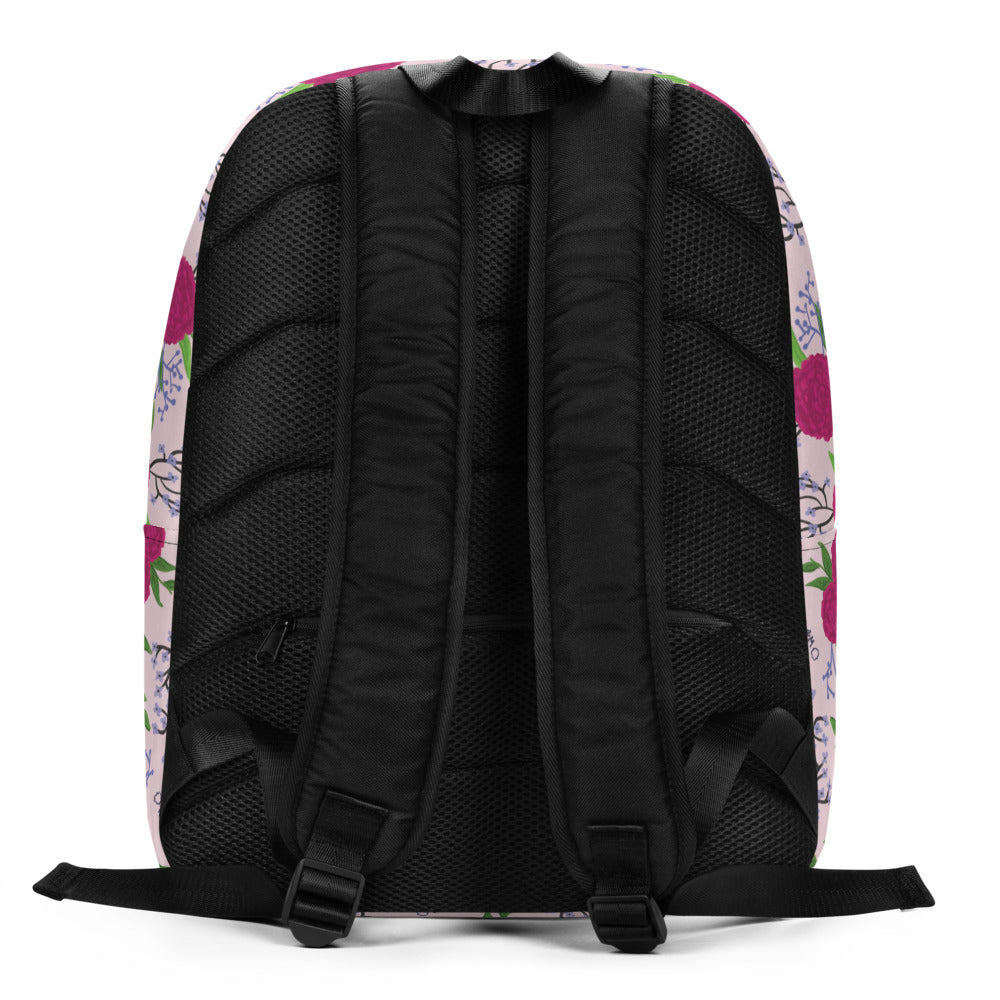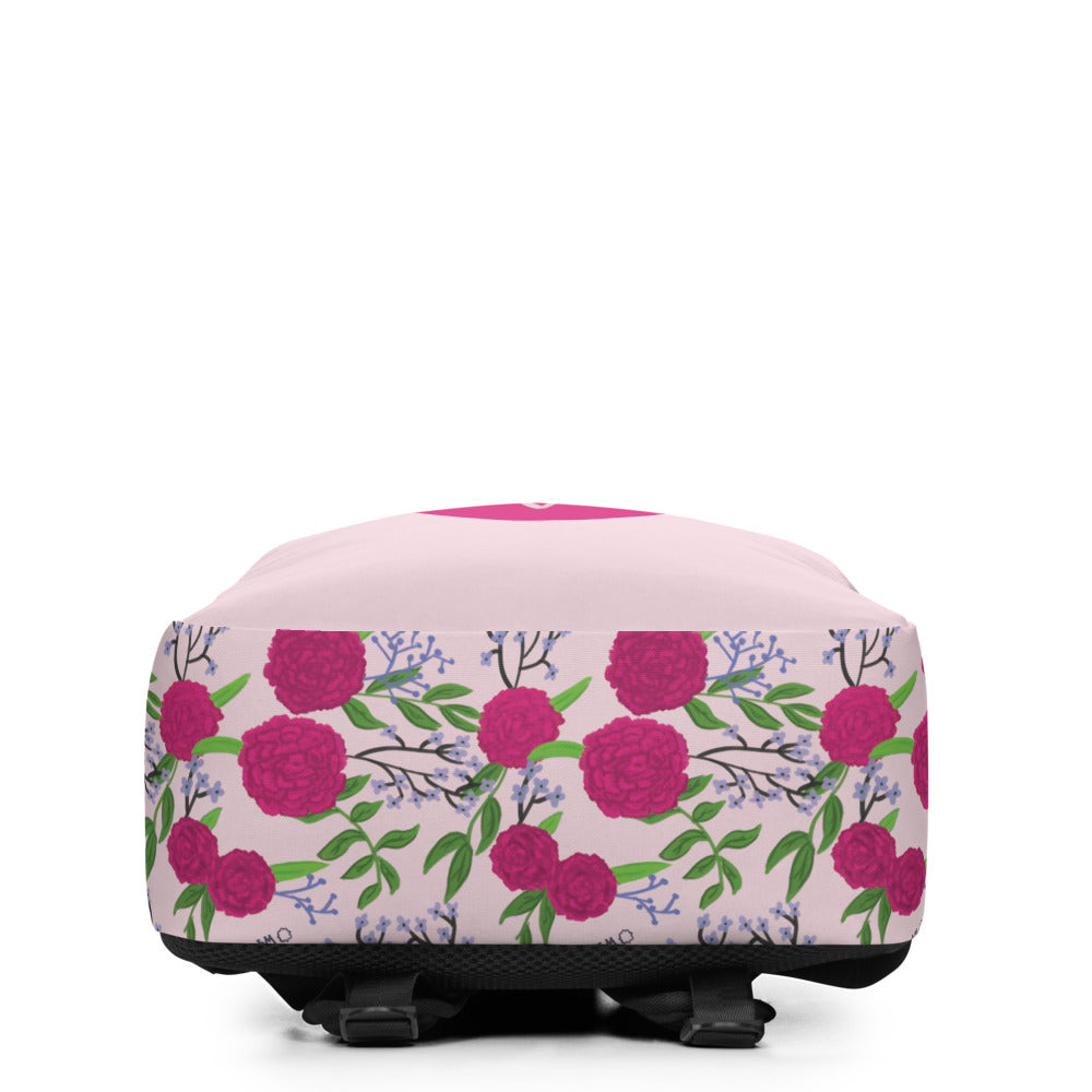 Phi Mu motto backpack in light pink with carnation floral print on sides and bottom