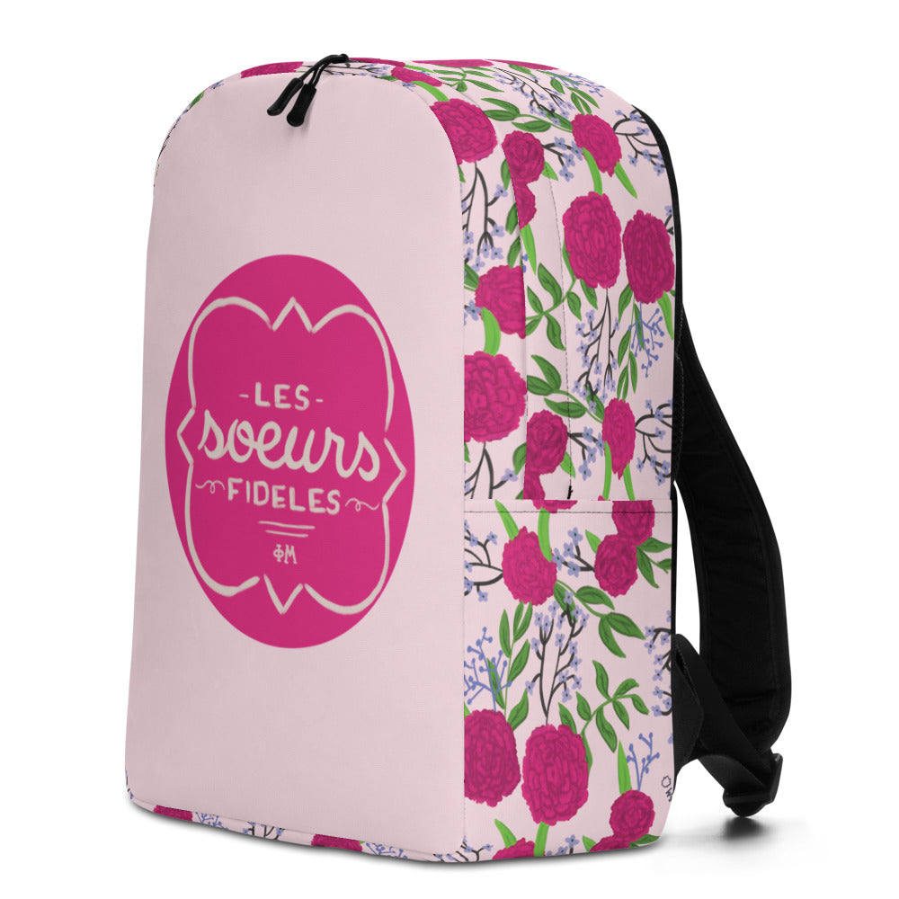 Pink Phi Mu motto backpack showing side view with rose colored carnation floral print