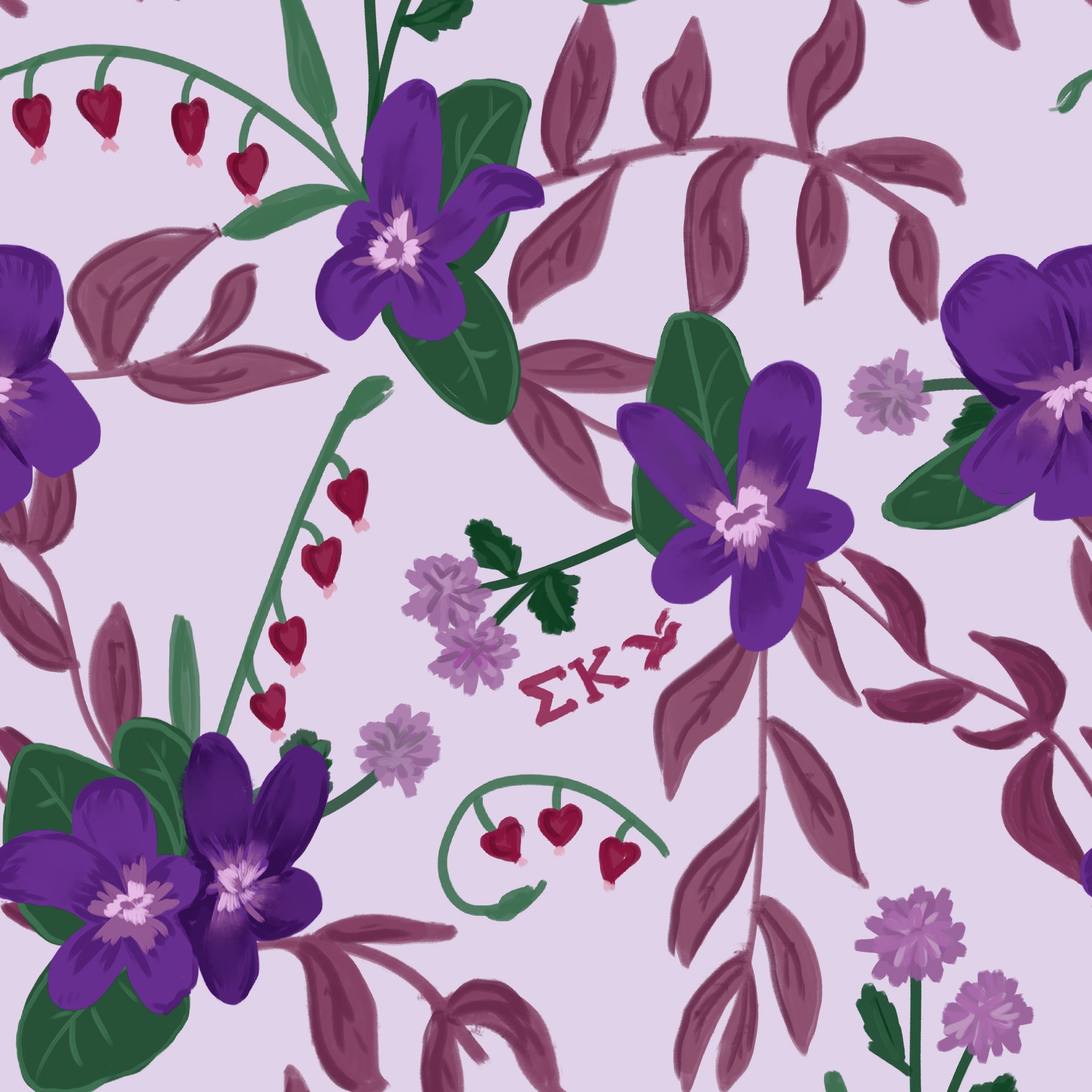 Close up view of hand drawn Sigma Kappa violet floral pattern with Greek letters in lavender color