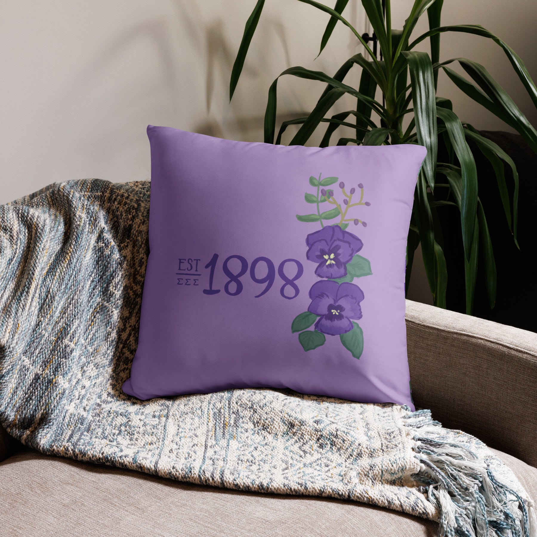Tri Sigma 1898 sorority pillow in 22" x 22" size shown on couch