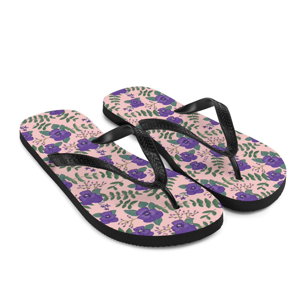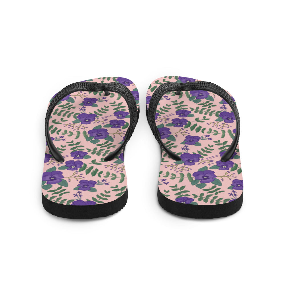 Tri Sigma violet floral print flip flops shown in light pink in lifestyle setting.