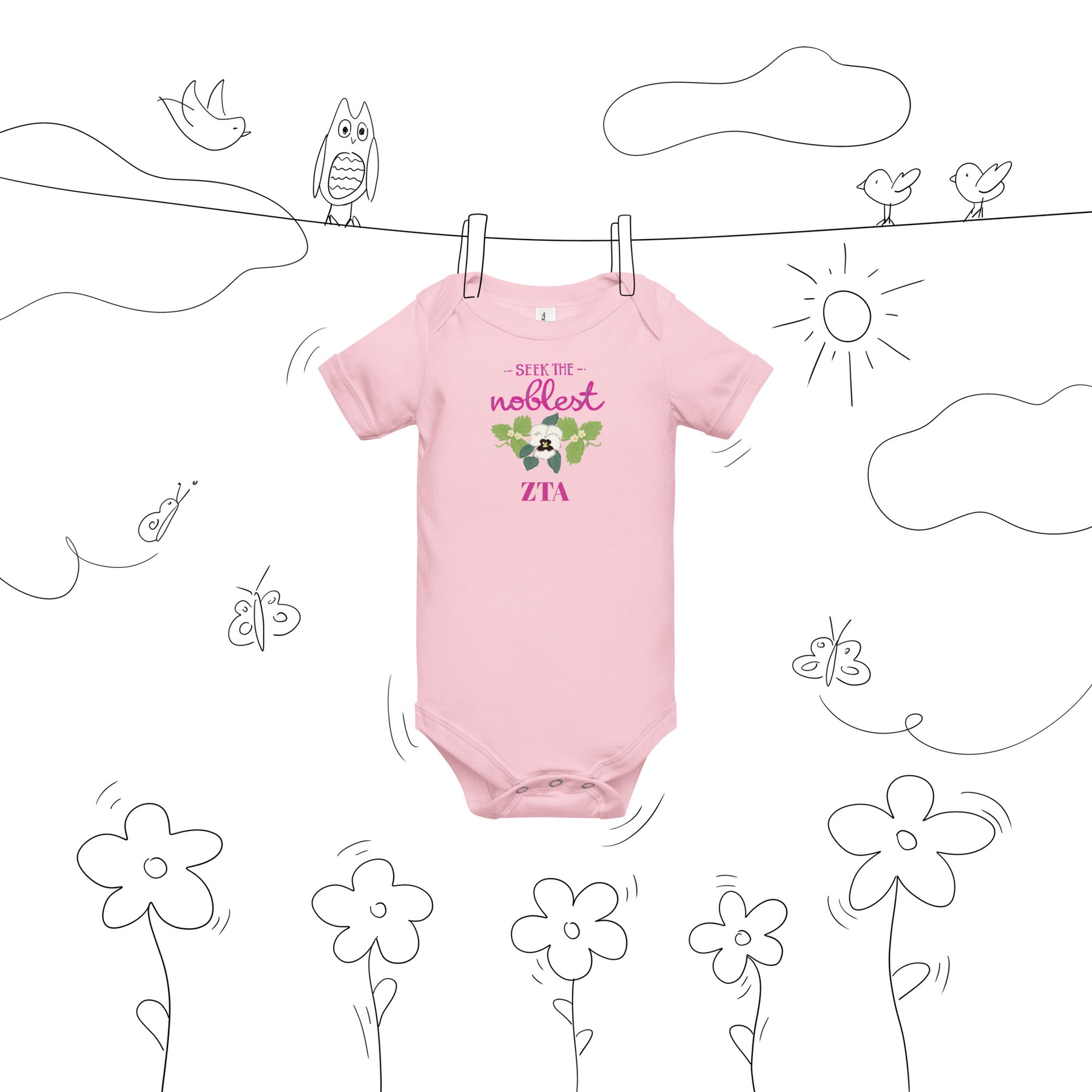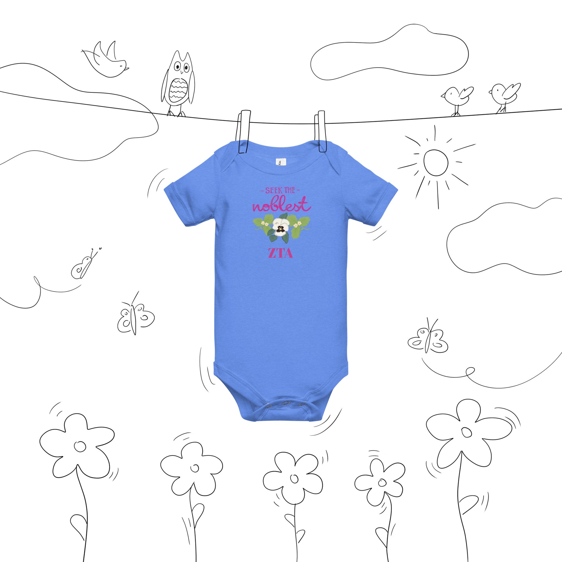 Zeta Tau Alpha Baby Onesie shown in white on clothesline with cute graphic