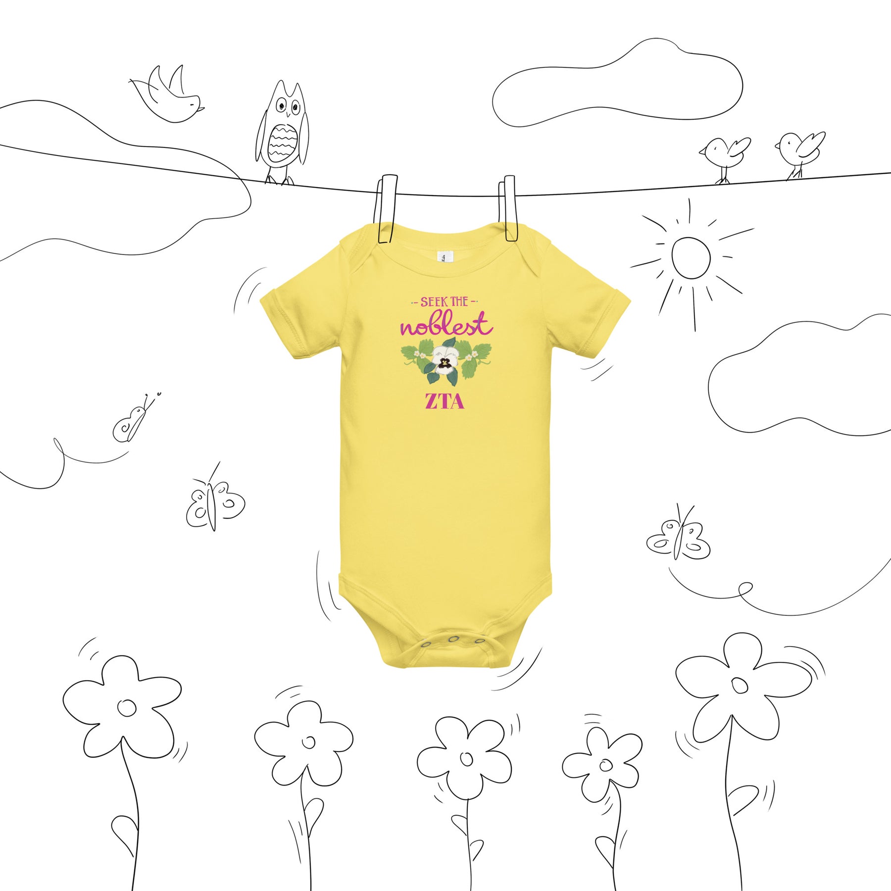 Zeta Tau Alpha Baby Onesie shown in yellow on clothesline with cute graphic